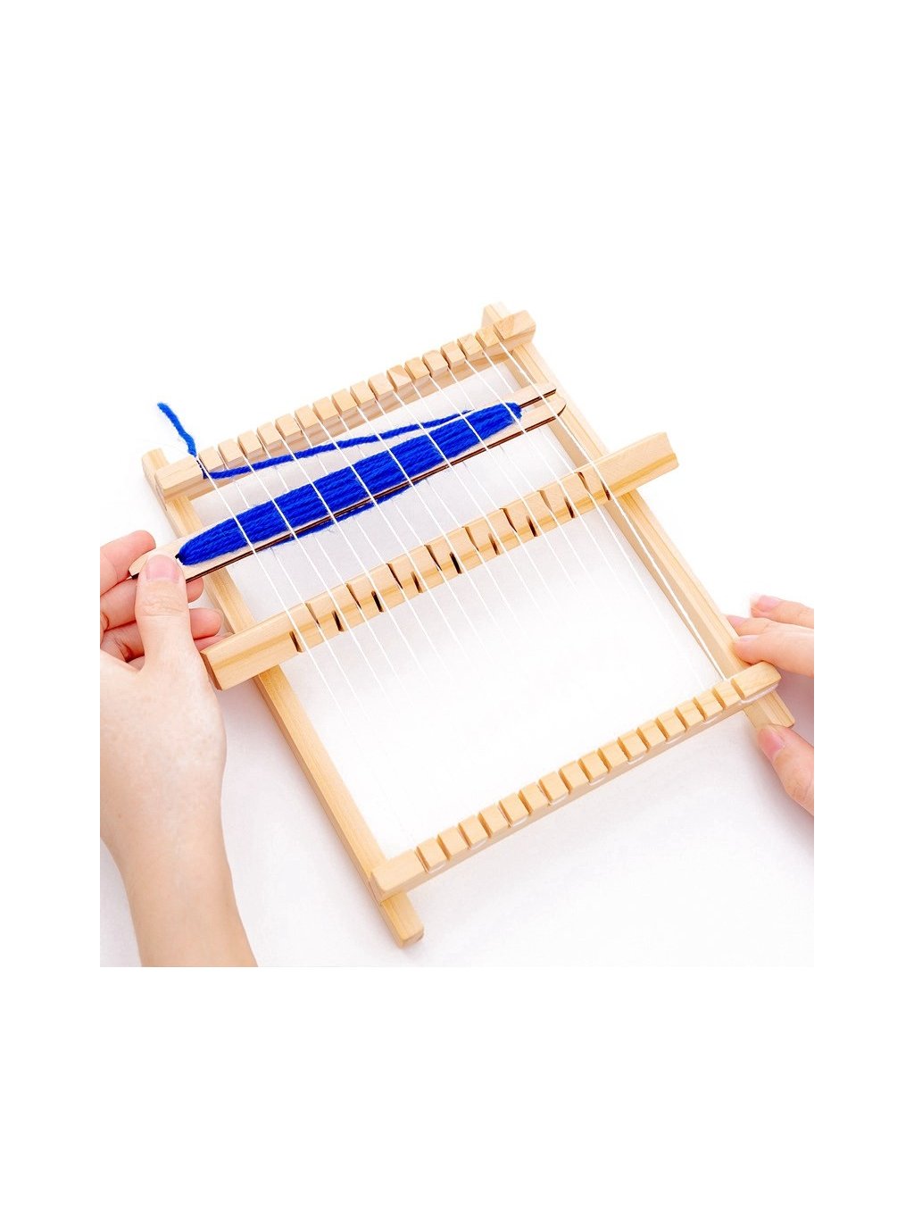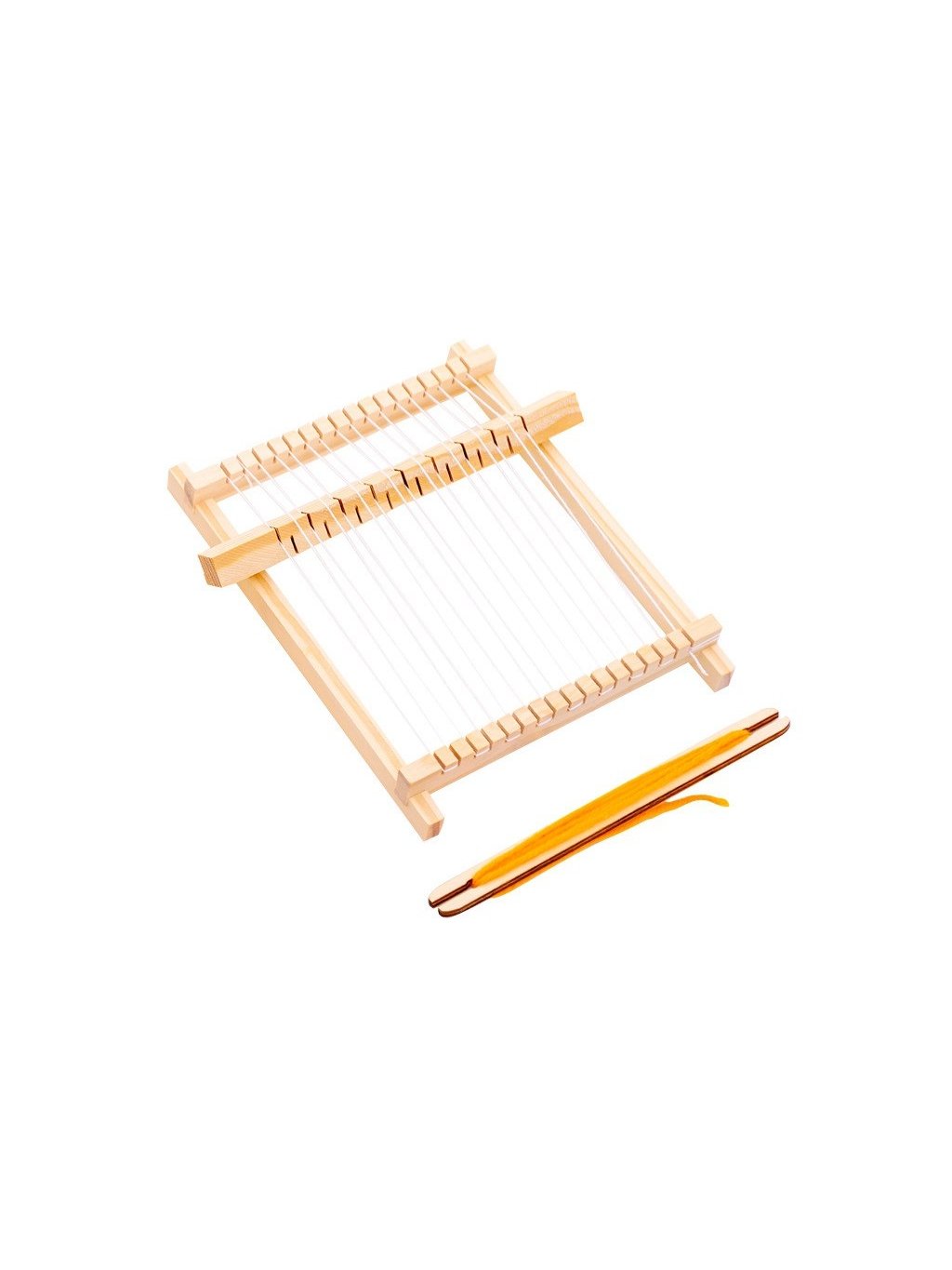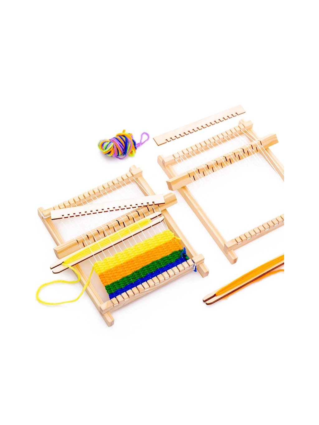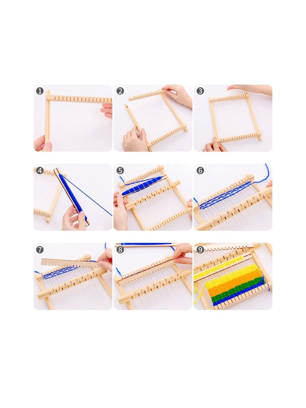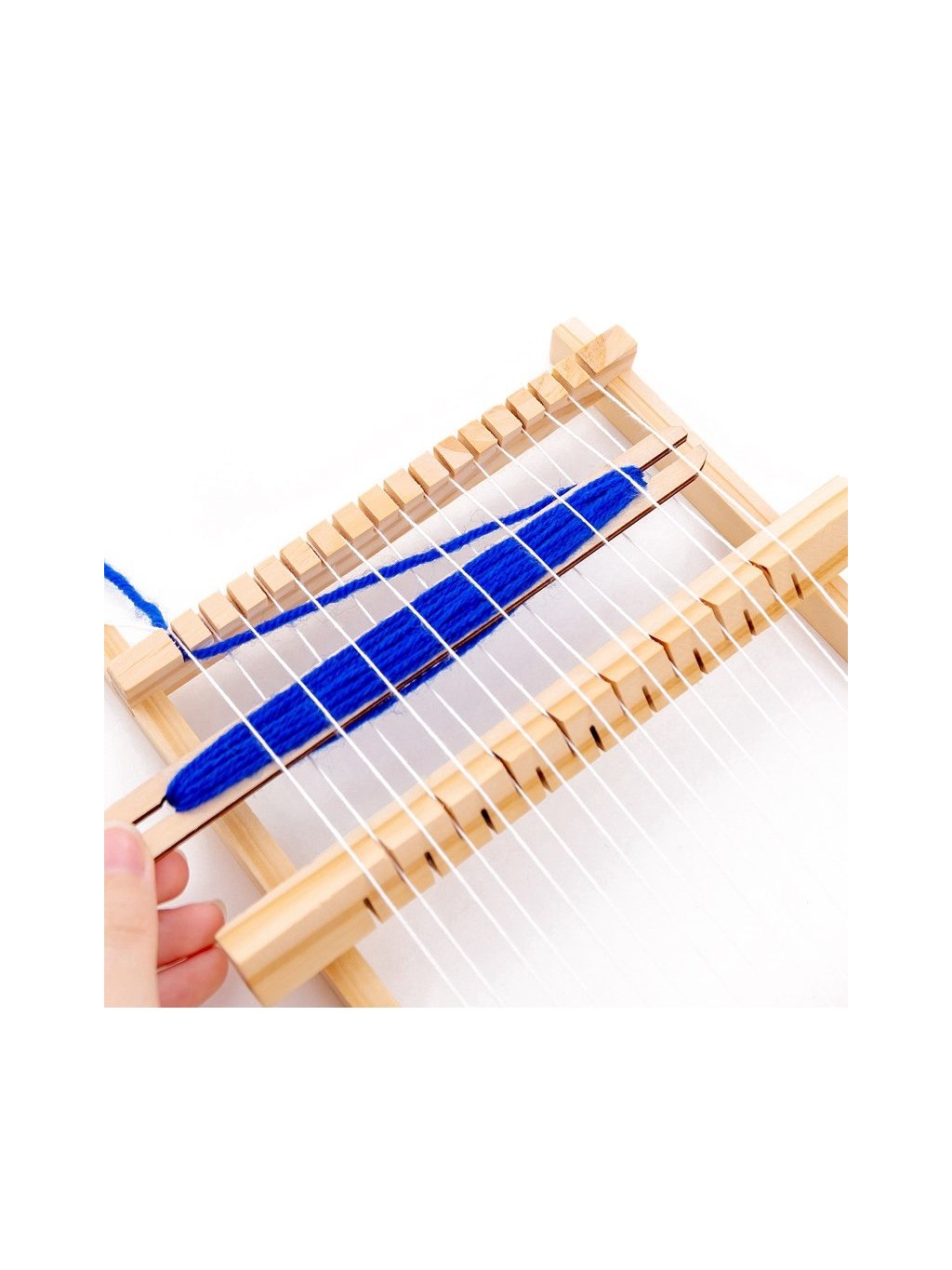 Návod: Na stav se nejprve napne vlněný provázek a pak již pomocí dvou člunků s namotanou vlnou vzájemně proplétáme skrze napnuté provázky na stavu.