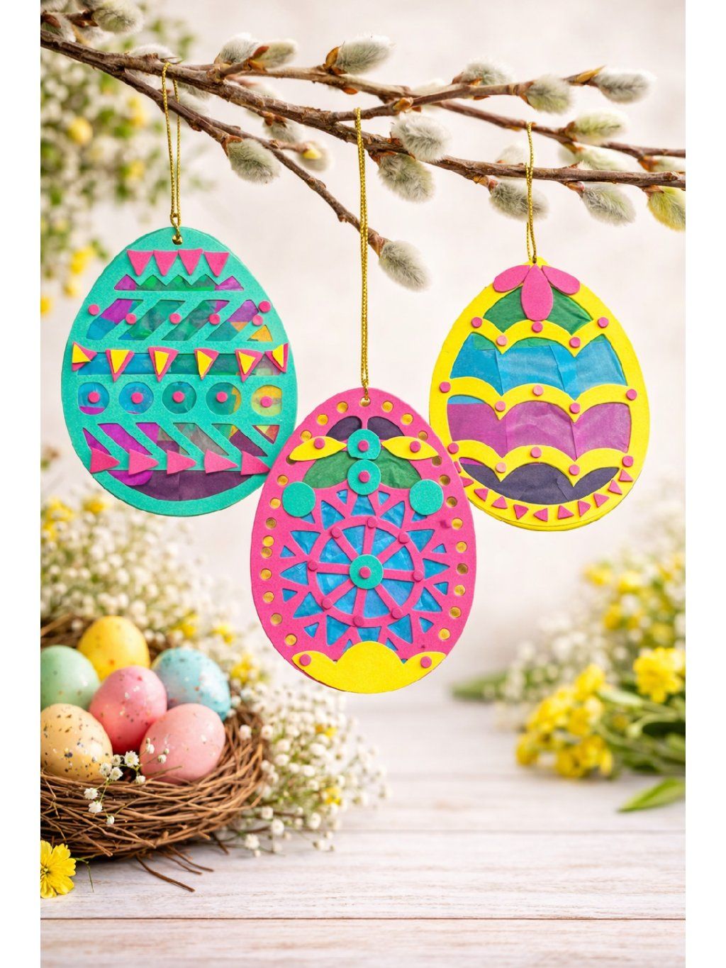 - Dekorace - Kreativní sada z mosgumy - pěnovky obsahuje: 6 vajíček z pěnovky zdobené, z jedné strany samolepicí, hedvábní papír, zlaté provázky k zavěšení.