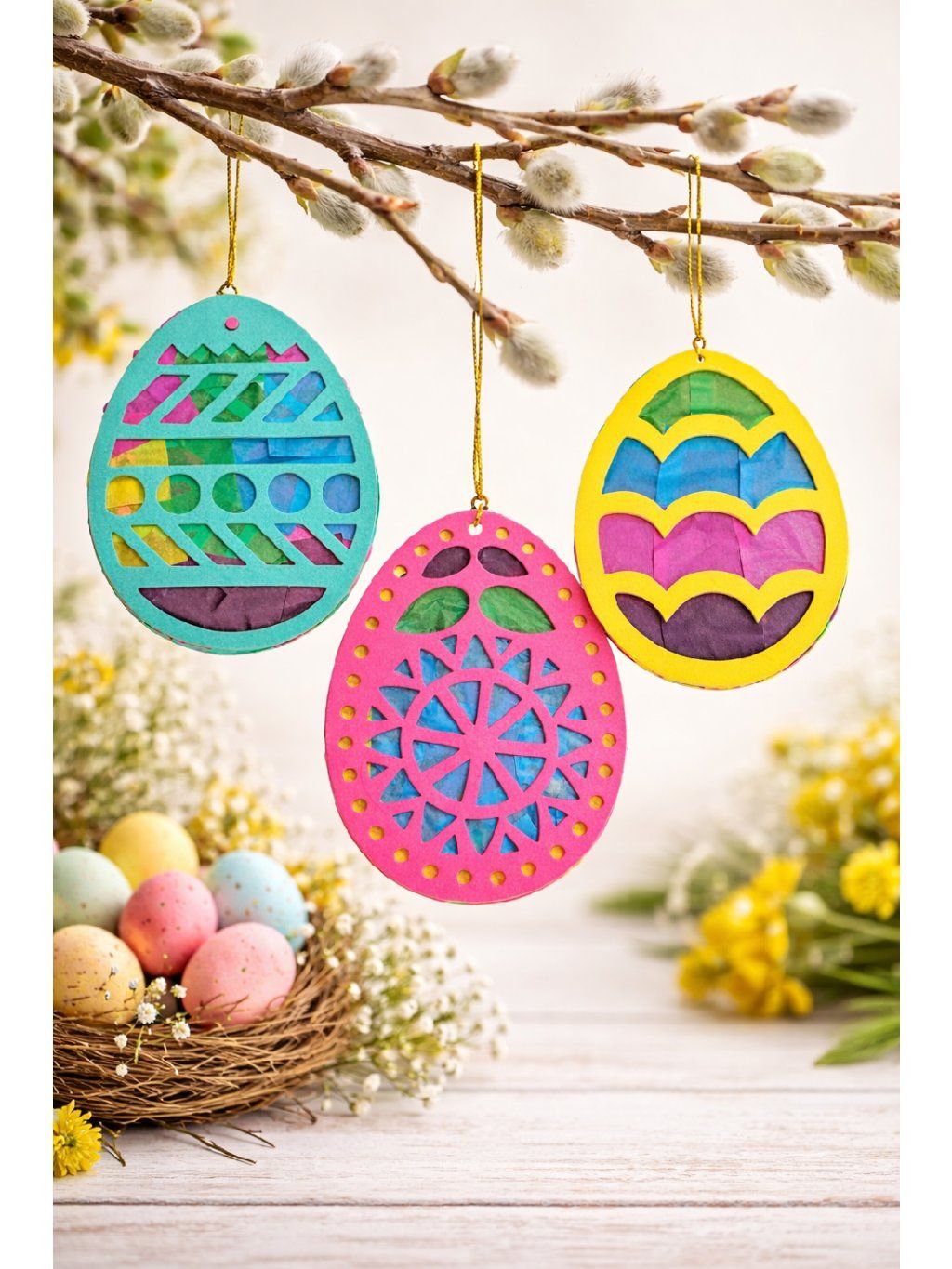- Postup: z vajíčka odstraníme folii ze samolepicí části , na kterou přikládáme hedvábný papír, dle barevného výběru. Poté provlečeme provázek. Přes hedvábný papír bude pronikat světlo a tak si zhotovíte nádhernou velikonoční dekoraci.