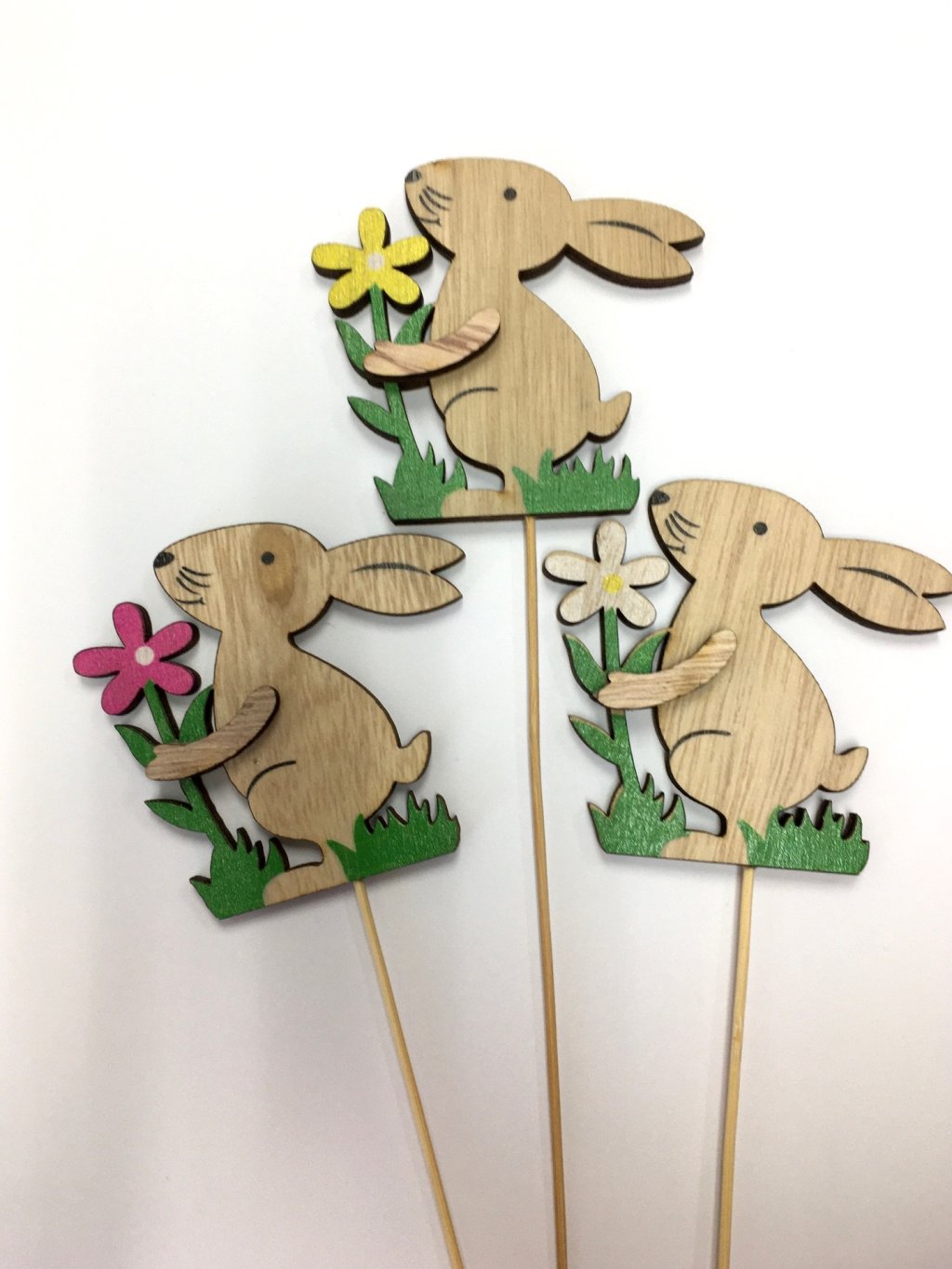 Zápich, dřev. dekorace, KRÁLÍCÍ S KVĚTINOU mix, dřevěnÝ, cca 7,5x8 cm/1ks