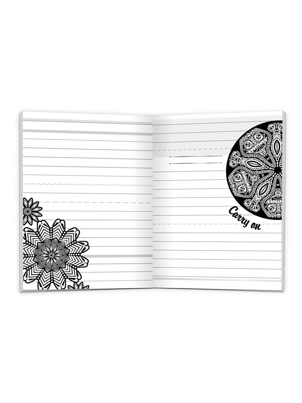 Kreativní zápisník s motivy mandal a anglickým textem pro náhodné poznámky, vždy po ruce.